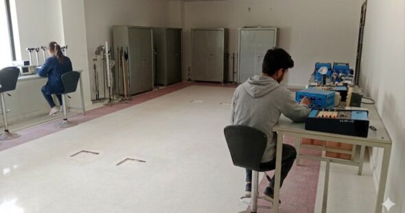 The Digital Logic Design laboratory setup , showcasing a professional environment equipped with high-precision digital trainer kits and diagnostic tools ready for student experimentation.