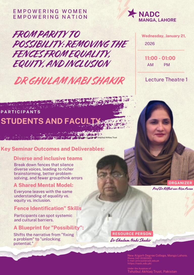 Students and faculty at NADC attended an insightful seminar titled “From Parity to Possibility,” led by Resource Person Dr. Ghulam Nabi Shakir. The session focused on “removing the fences” from equality, equity, and inclusion to foster a culture of excellence and unlock potential.
